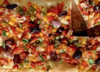 Νηστίσιμη παραδοσιακή σπιτική πίτσα με πιπεριές και ελιές