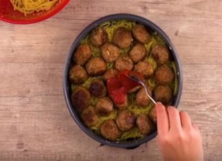 Βάζει μακαρόνια σε ταψί και πετάει πάνω τα κεφτεδάκια με σάλτσα ντομάτας και τυρί...